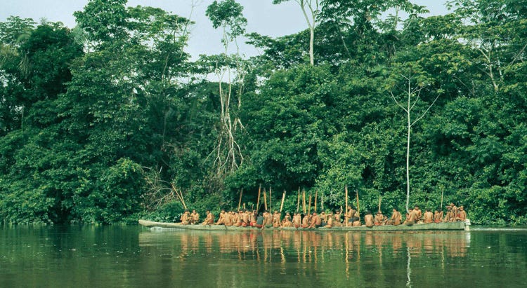 assourdie par le vacarme des canons, la jugeote occidentale est longtemps restée sclérosée et imperméable à toute autre appréhension du monde. Il faut avouer que le globe avait un autre visage il y a cinq cents ans, au moment de la découverte de l’Amérique.Curieusement, cette opinion méprisante n’a souvent pas fondamentalement changé depuis. Pendant la quasi- totalité du XXème siècle, on a considéré l’Amazonie comme une forêt tropicale uniforme et vierge. Elle n’aurait ainsi été peuplée que d’indigènes indigents, soumis depuis des temps immémoriaux aux caprices de la nature. Selon la théorie de l’écologie culturelle, l’environnement forestier tropical, perçu a priori comme hostile et défavorable, aurait ainsi décidé des degrés culturels et de progrès humains. Le paradigme du déterminisme écologique voulait ainsi que la géographie conditionnât la culture. Cette théorie se développa aux États- Unis durant la première moitié du XXème siècle, jusqu’à dominer la pensée anthropologique.